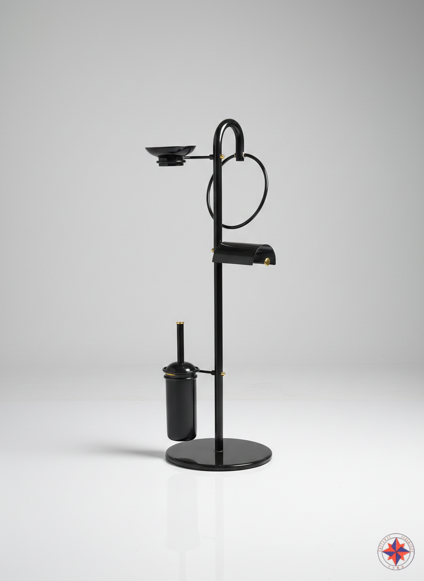 piantana nera dal design geometrico è un set da bagno funzionale che combina un portarotolo, portasapone e un portascopino.